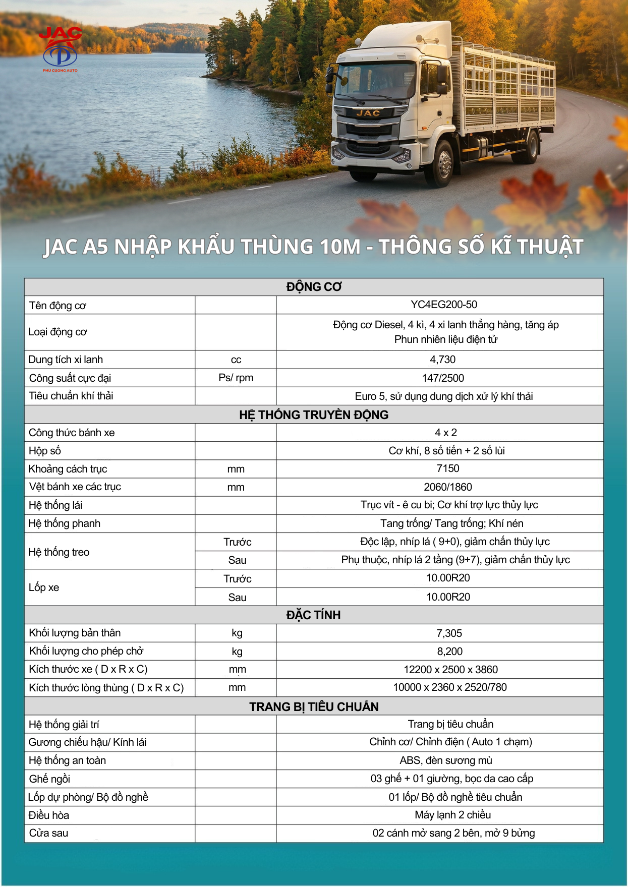Với chất lượng nhập khẩu nguyên chiếc và thiết kế tối ưu cho nhu cầu vận tải đường dài, JAC A5 thùng bạt 10m không chỉ là một phương tiện vận chuyển mà còn là một đối tác kinh doanh đáng tin cậy, giúp doanh nghiệp nhanh chóng thu hồi vốn và phát triển bền vững