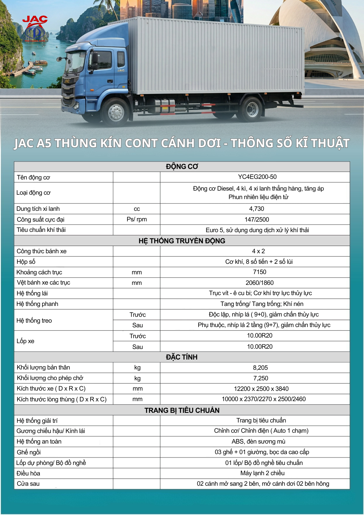 Xe tải JAC A5 nhập khẩu 2 chân (cấu hình 4x2) sở hữu ngoại thất hiện đại, mạnh mẽ với thiết kế cabin A5 thế hệ mới theo tiêu chuẩn Châu Âu. Mặt trước của xe gây ấn tượng bởi cụm ga lăng màu đen 3 tầng có các rãnh dẫn khí được thiết kế tinh xảo giúp làm mát động cơ và giảm sức cản gió