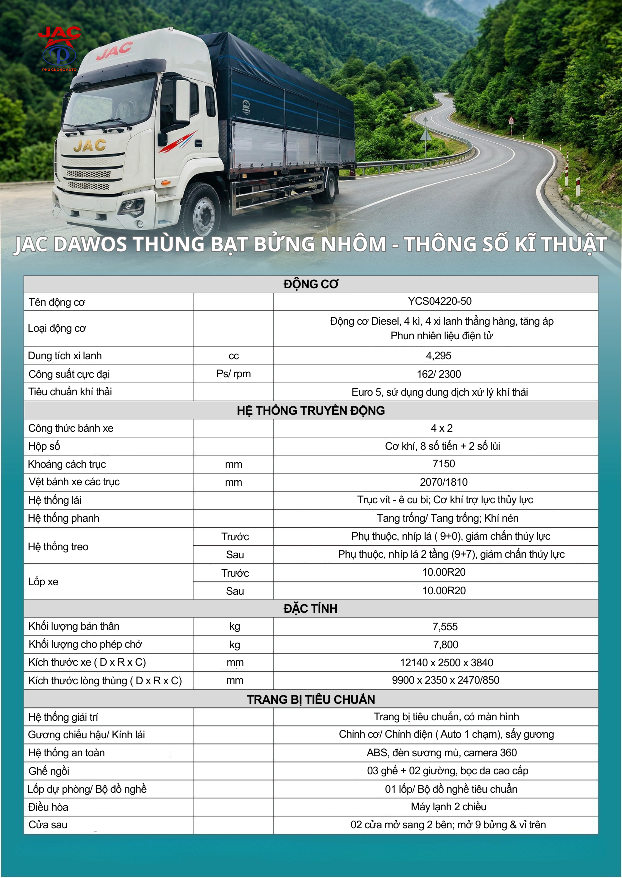 Xe tải JAC DAWOS sở hữu kiểu dáng hoàn toàn mới, mang phong cách thiết kế cabin vuông nóc cao mạnh mẽ và hiện đại. Toàn bộ cabin được sơn tĩnh điện công nghệ cao giúp màu sơn sáng bóng, bền màu theo thời gian và trang bị kính chắn gió chống tia hồng ngoại giúp bảo vệ sức khỏe tài xế