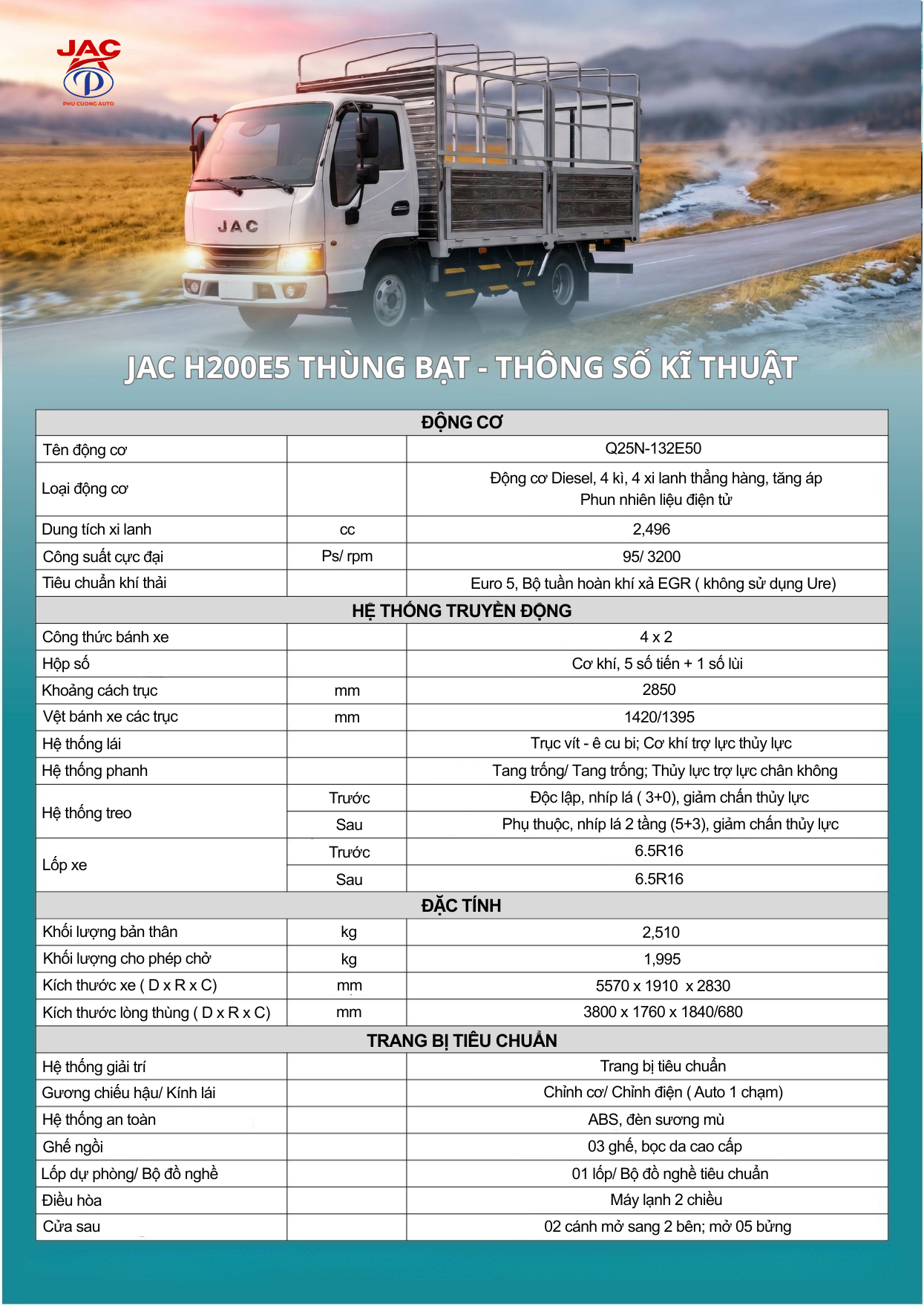 • Giá xe JAC H200E5 thùng bạt: Giá công bố từ đại lý ( Liên hệ)