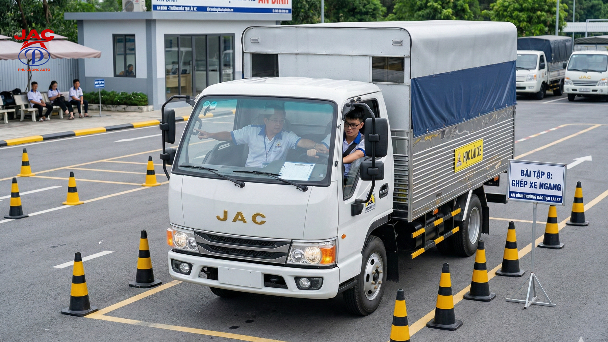 Thùng xe thiết kế 2 hàng ghế ngồi bọc da sạch sẽ và hai tấm bạt hai bên để che nắng mưa cùng với hai lỗ thông gió, tạo điều kiện cực kỳ thuận lợi và nhanh chóng cho học viên thay phiên nhau lái xe