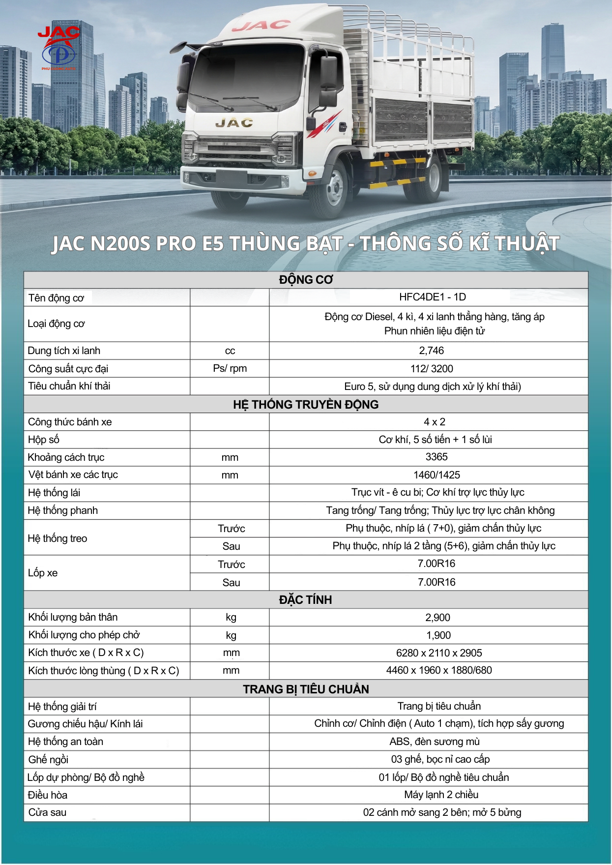 Ngoại thất của JAC N200S Pro E5 gây ấn tượng với thiết kế cabin vuông hiện đại, sang trọng theo phong cách Châu Âu, kết hợp cùng mặt ga lăng mạ Crom và cụm đèn LED chữ C độc đáo tạo nên diện mạo mạnh mẽ và hầm hố