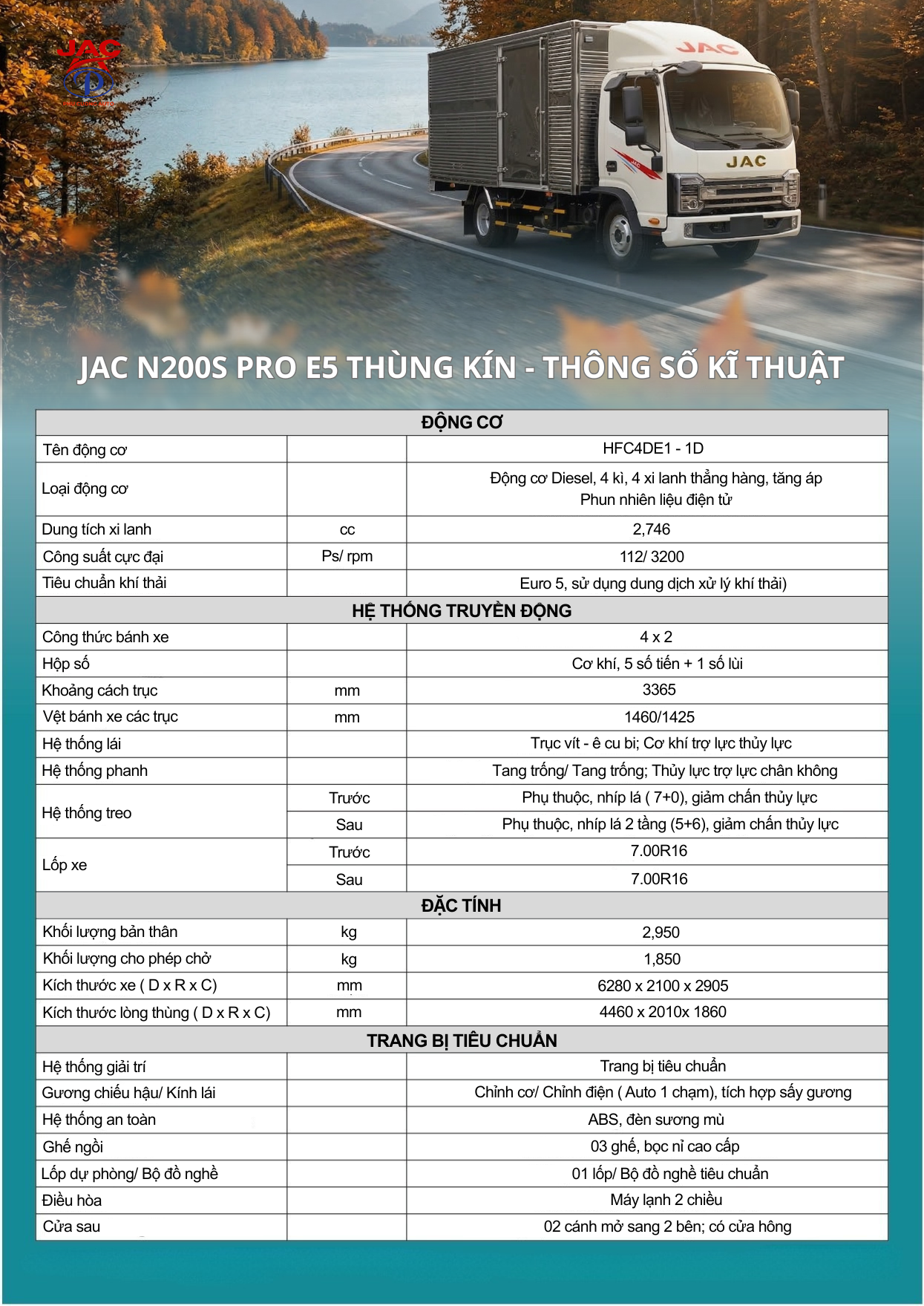 JAC N200S Pro E5 thùng kín là một chiếc xe có khả năng vận hành mạnh mẽ, an toàn và cực kỳ kinh tế, đặc biệt phù hợp cho các doanh nghiệp vận tải cần sự linh hoạt trong đô thị và sức mạnh để chinh phục đường trường.