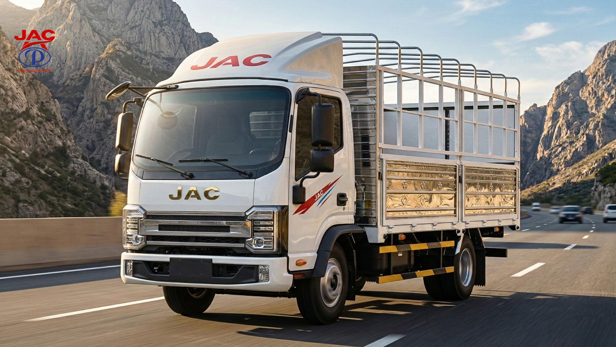 Đầu xe nổi bật với Logo JAC mạ Crom vàng và mặt ga lăng có lưới tản nhiệt mạ Crom hình chữ nhật, không chỉ tăng tính thẩm mỹ mà còn giúp tối ưu hóa lượng gió hút vào để tản nhiệt cho động cơ hiệu quả hơn