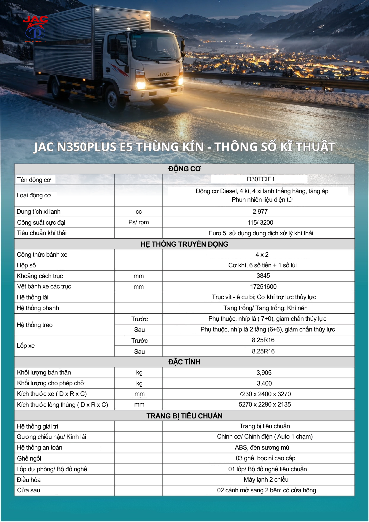 Xe tải JAC N350Plus E5 gây ấn tượng với thiết kế cabin vuông hiện đại, mang phong cách mạnh mẽ và cứng cáp, nổi bật với mặt ca lăng và lưới tản nhiệt mạ Crom sáng bóng, kết hợp cùng logo JAC màu vàng sang trọng tạo điểm nhấn thương hiệu đặc trưng