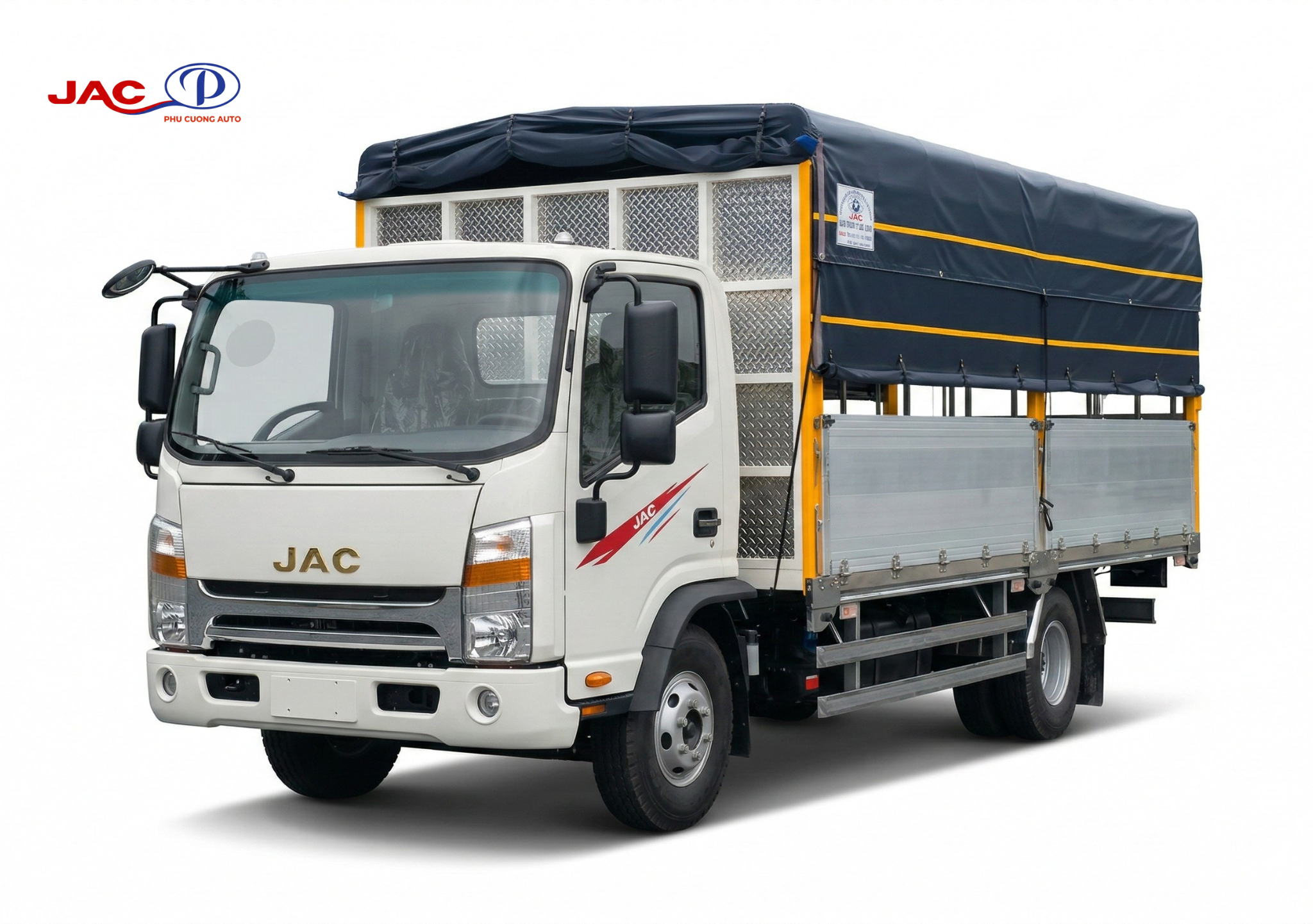 Xe tải JAC N650 E5 gây ấn tượng với thiết kế cabin vuông hiện đại, mang phong cách mạnh mẽ và cứng cáp, nổi bật với mặt ca lăng và lưới tản nhiệt mạ Crom sáng bóng, kết hợp cùng logo JAC màu vàng sang trọng tạo điểm nhấn thương hiệu đặc trưng