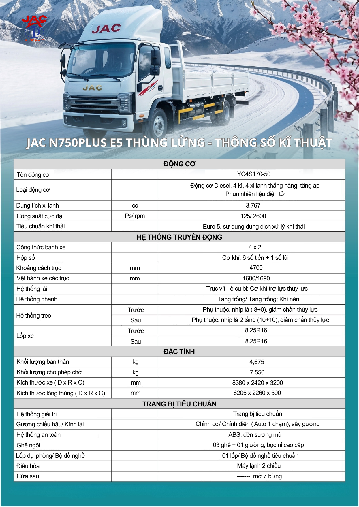 Với sự kết hợp giữa sức mạnh động cơ, độ bền khung gầm và sự tiện nghi đỉnh cao, JAC N750Plus E5 thùng lửng không chỉ là một phương tiện vận tải mà còn là một “người bạn đồng hành” tin cậy, giúp các chủ xe tối ưu hóa chi phí và phát triển kinh doanh bền vững.