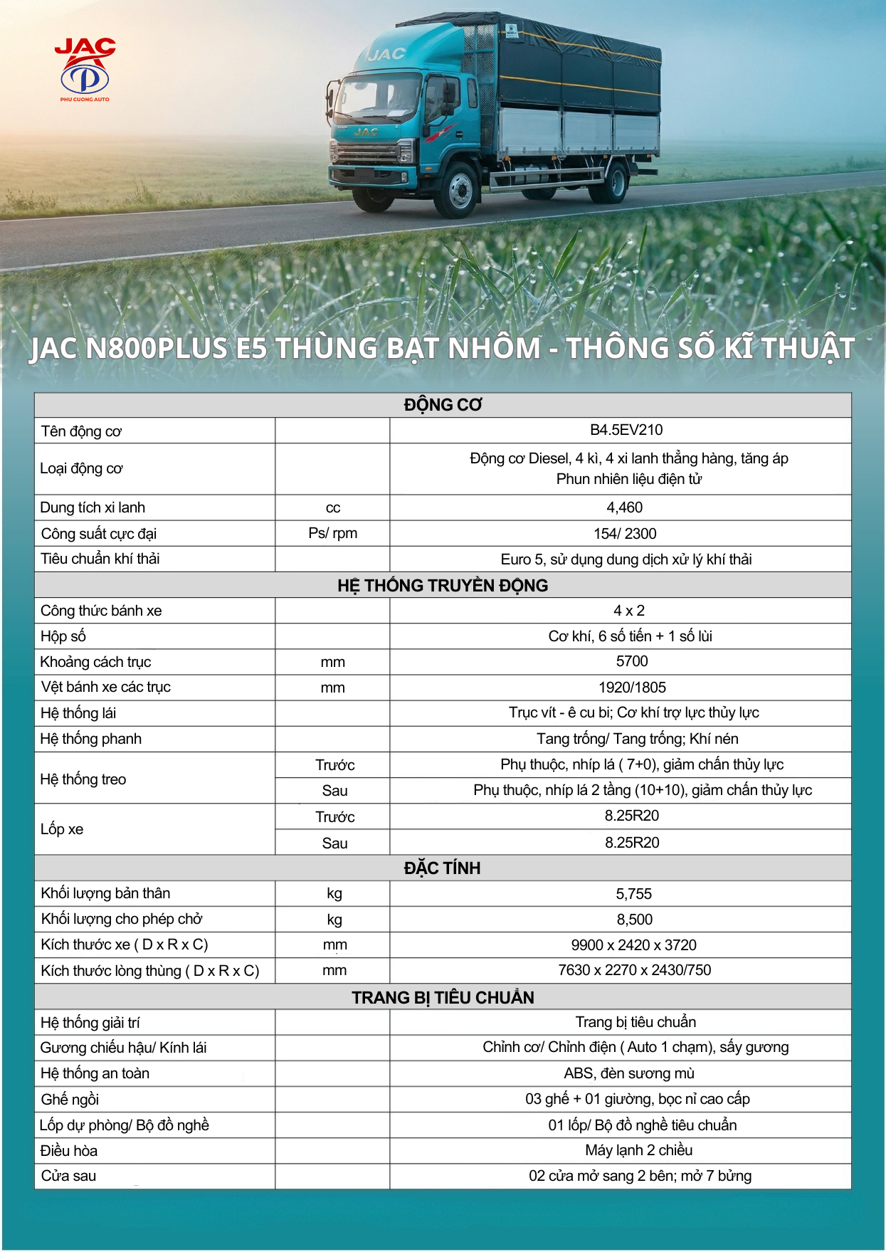 Với những ưu điểm vượt trội về cả kỹ thuật lẫn kinh tế, JAC N800 Plus E5 thùng bạt nhôm không chỉ là phương tiện vận tải mà còn là một đối tác tin cậy, giúp các nhà đầu tư nhanh chóng thu hồi vốn và phát triển kinh doanh bền vững.