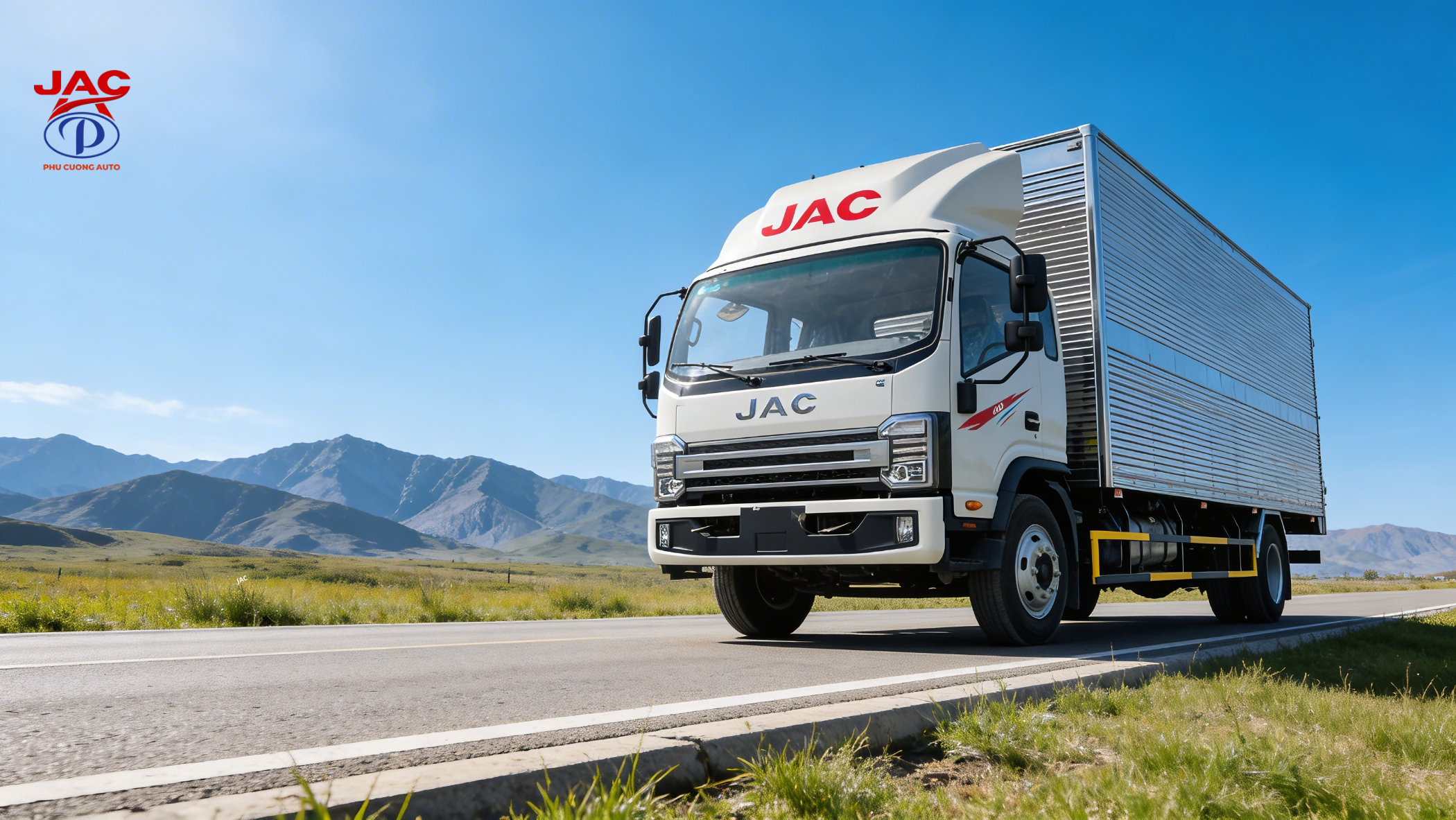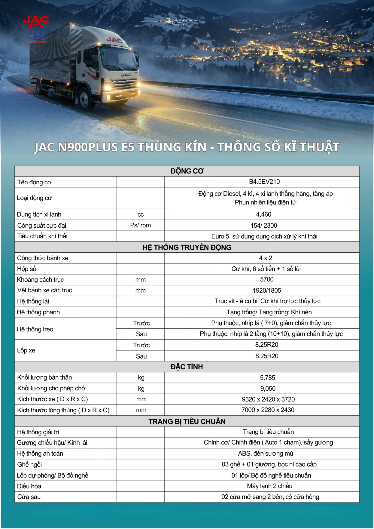 Xe JAC N900Plus E5 sở hữu phong cách thiết kế Châu Âu hiện đại và mạnh mẽ với kiểu dáng cabin vuông đặc trưng. Phần đầu xe nổi bật với lưới tản nhiệt bản lớn mạ crom sáng bóng cùng logo JAC được bố trí chính giữa tạo tính nhận diện thương hiệu cao.